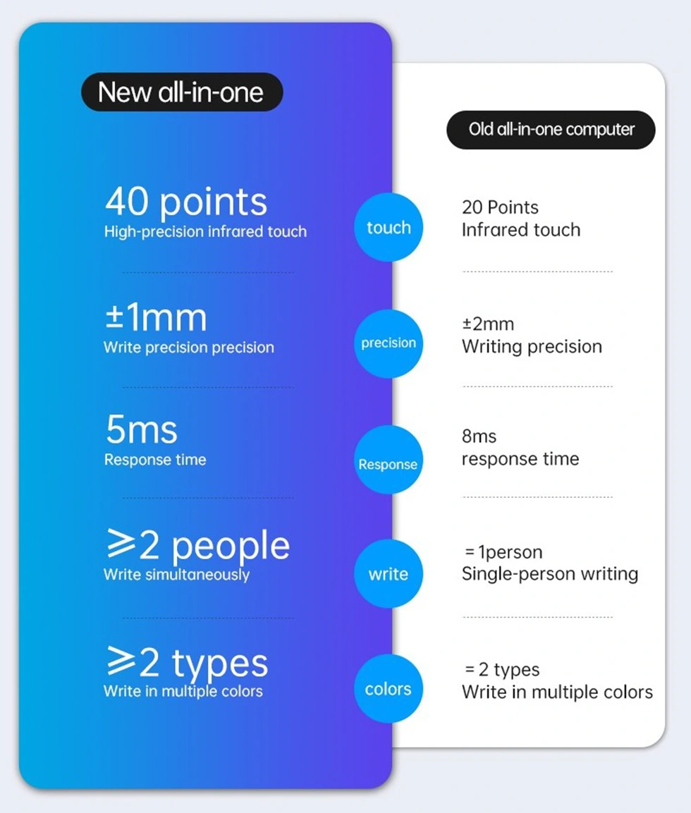 Geavanceerde infrarood-aanraaktechnologie bevordert een naadloze samenwerking met zeer responsieve en nauwkeurige aanraakinteractie. Het ondersteunt samenwerking tussen meerdere gebruikers met 40 aanraakpunten en intuïtieve gebarenbediening voor zoomen en navigeren. De technologie biedt ook aanpasbare peninstellingen en een uitbreidbare werkruimte om aan uiteenlopende professionele behoeften aan te passen.